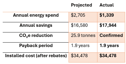 The ‘Actual’ figures reflect four months of billing data after installation. Note this period covers summer months where solar production is highest, hence the improved figures compared to projections. These figures will likely stabilise over a full 12-month period.